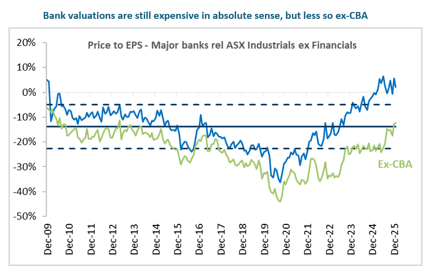 Banks offer earnings strength beyond the rally: Despite the substantial outperformance of banks since early 2024, we believe the sector still has further to run. Earnings upgrades continue to be driven by exceptionally benign credit conditions—low bad debt expenses and ongoing provision releases—alongside healthy mid-to-high single-digit volume growth and well-controlled cost growth delivering modest pre-provision profit expansion. The sector benefits from stable structural fundamentals: strong capital and provisioning buffers, no competitive disruption on the horizon, and a very mild credit cycle with no earnings cliff in sight. While valuations now appear stretched on most measures, banks ex-CBA look considerably more attractive, justifying our selective approach and ongoing preference for NAB and Westpac.