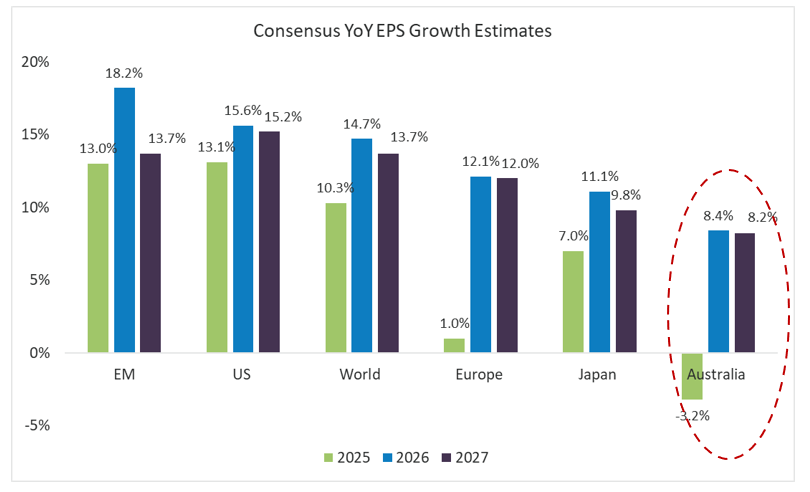 Earnings: A Return to Growth: Australian earnings are poised to deliver positive growth for the first time in three years, with resources leading the charge. The earnings leadership rotation toward Metals & Mining appears durable, underpinned by a potent combination of better-than-feared global demand, ongoing supply constraints, a weakening US dollar, and crucially, conservative sell-side commodity price assumptions. This creates fertile ground for continued earnings upgrades and presents potential upside to the Australian earnings growth forecasts presented below.