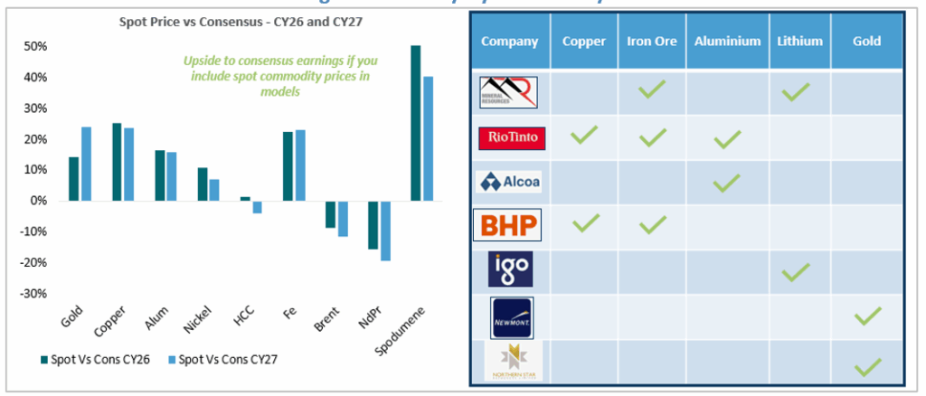 Resources are set to shine: Consistent with the earnings leadership shift toward Metals & Mining and our positive view on its sustainability, we are entering 2026 with substantial exposure to resources. We favour transition metals, such as copper, aluminium and lithium, given the outlook for further earnings upgrades driven by better-than-feared global demand, ongoing supply constraints, a weakening US dollar, and crucially, conservative sell-side commodity price assumptions. We are overweight a mix of single-commodity producers, such as Mineral Resources, Alcoa and IGO, and diversified miners, including both BHP and RIO. In addition, we maintain our exposure to iron ore as we believe the market is tighter than generally appreciated and remain relatively neutral gold, through producers such as Newmont and Northern Star, given the strength in the gold price driven by increased central bank buying and its safe haven status amid an uncertain geopolitical outlook.