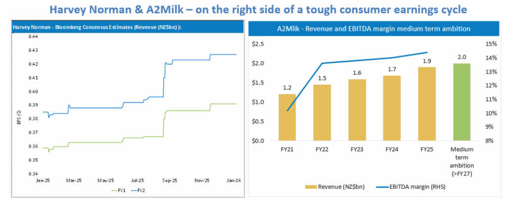 Within Staples, we are underweight supermarkets due to intense competitive dynamics as traditional players lose share to new entrants, raising the risk of a margin-damaging price war. We also avoid alcohol given company-specific challenges compounded by what appears to be structural volume decline. By contrast, Harvey Norman and A2 Milk remain our preferred consumer plays, both offering structural tailwinds and clearer paths to earnings growth.