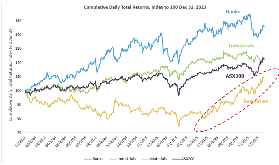 Resources delivered the most striking narrative of 2025. After years of downgrades and investor scepticism, the materials sector staged a spectacular comeback, delivering returns exceeding 30%. The rally unfolded in waves: gold continued its rally yet accelerated towards the end of the year, as it broadened initial gains came from more leveraged single stock exposures before extending to the large-cap diversified miners. The question now is whether this rotational momentum can be sustained.