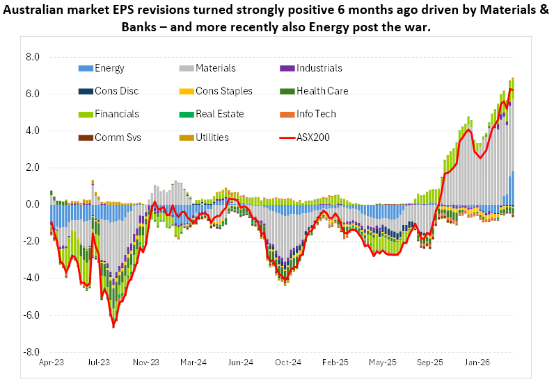 Australia had a genuinely strong six months of earnings upgrades heading into this period. That momentum is now at risk. We’re watching closely for where cost pressures and supply chain disruptions begin to feed through, particularly across the large-cap miners and banks, which have driven the bulk of recent earnings momentum.