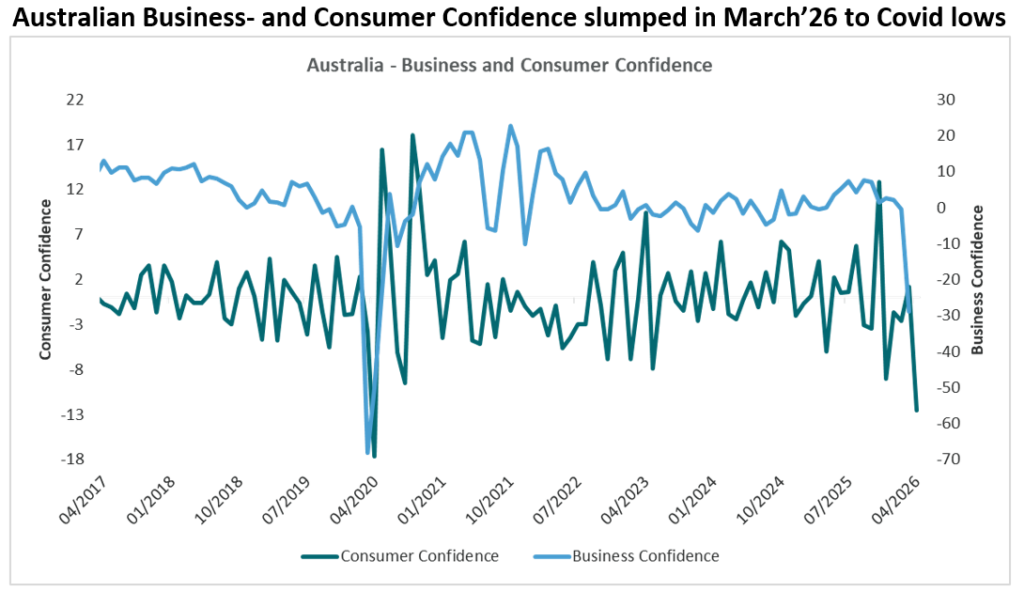 Australia entered this period with a problem most markets didn’t have to the same extent: a persistent lift in underlying inflation that had already forced the RBA’s hand. Two rate rises into a new cycle, and central bank credibility was already being tested. Consumer confidence had begun to wobble, and spending was pulling back even before the uncertainty and inflation caused by the war was a risk.
