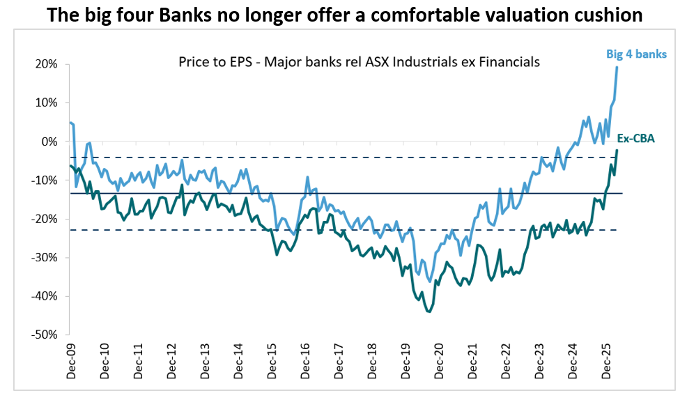 - We’ve moved to small underweight on Banks, shifting exposure a bit toward Insurance — a less beta-sensitive part of the sector. Bank valuations look stretched; ex-CBA the picture improves, but recent market moves make even a relative value argument difficult to sustain.