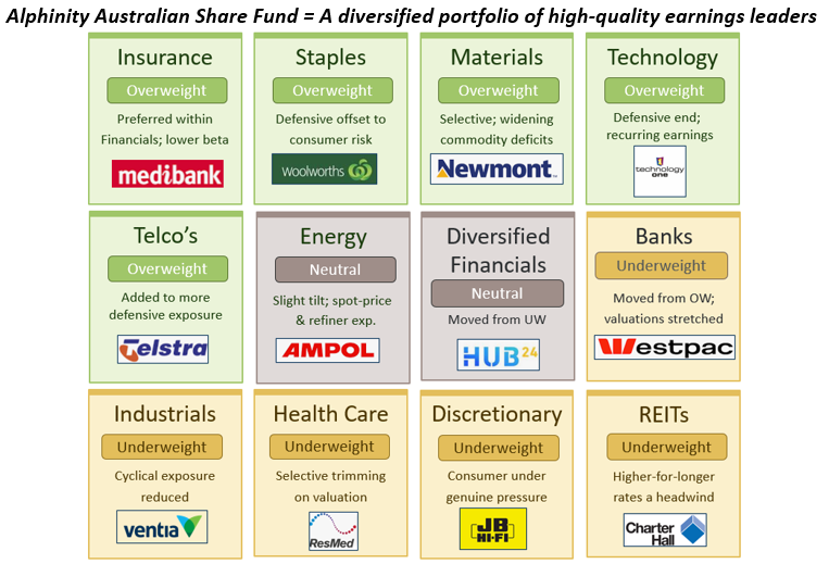 - • We’ve taken profits in global and domestic cyclicals — metals and mining, discretionary, and banks — where earnings are most exposed to an economic slowdown. In their place, we’ve added to defensive earnings streams: Staples (Woolworths), Telecommunications (Superloop, Telstra), and Insurance (Insurance Australia Group, Medibank).